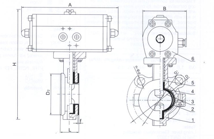 1.閥體   2.蝶圈   3.蝶板   4.四氟圈    5.碟形彈性墊圈    6.氣動裝置