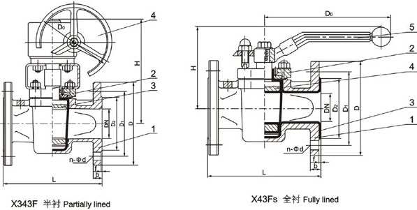 1.閥體 2.閥蓋 3.閥體襯里 4.塞子 5.蝸輪裝置