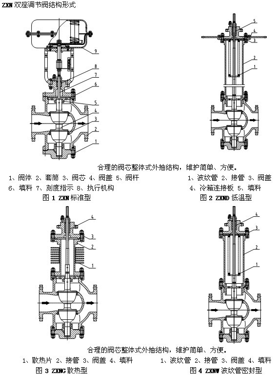 有兩個閥芯和閥座,采用“四通”閥體,可以方便地由正裝改裝成反裝,氣關閥變氣開閥。
