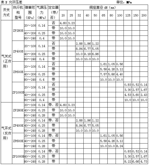 注 1)對于ZXNW型雙座波紋管密封調節閥,最大允許壓差為1.0MPa,表中數據若數值小于1.0MPa則不變,若數值大于1.0MPa,則取值1.0MPa。